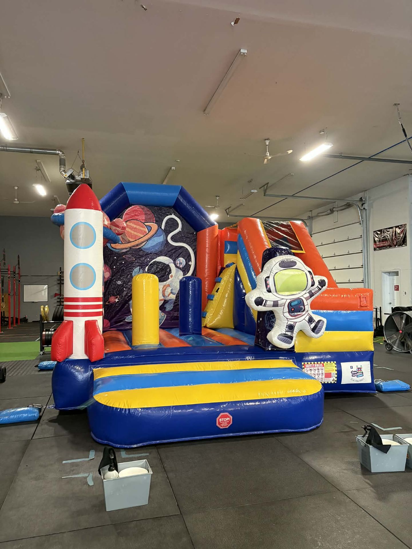 1 jeu Astronaute , 1 souffleurs, 1 sac de transport, 2 sangles d'attache et 4 ancrages.