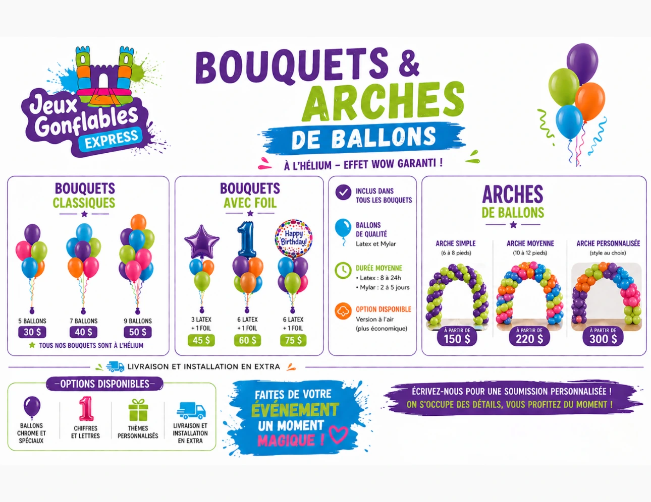 Explorez nos montages de ballons et trouvez le décor parfait pour votre événement. Plusieurs modèles sont disponibles en stock… il ne vous reste qu’à choisir votre coup de cœur !